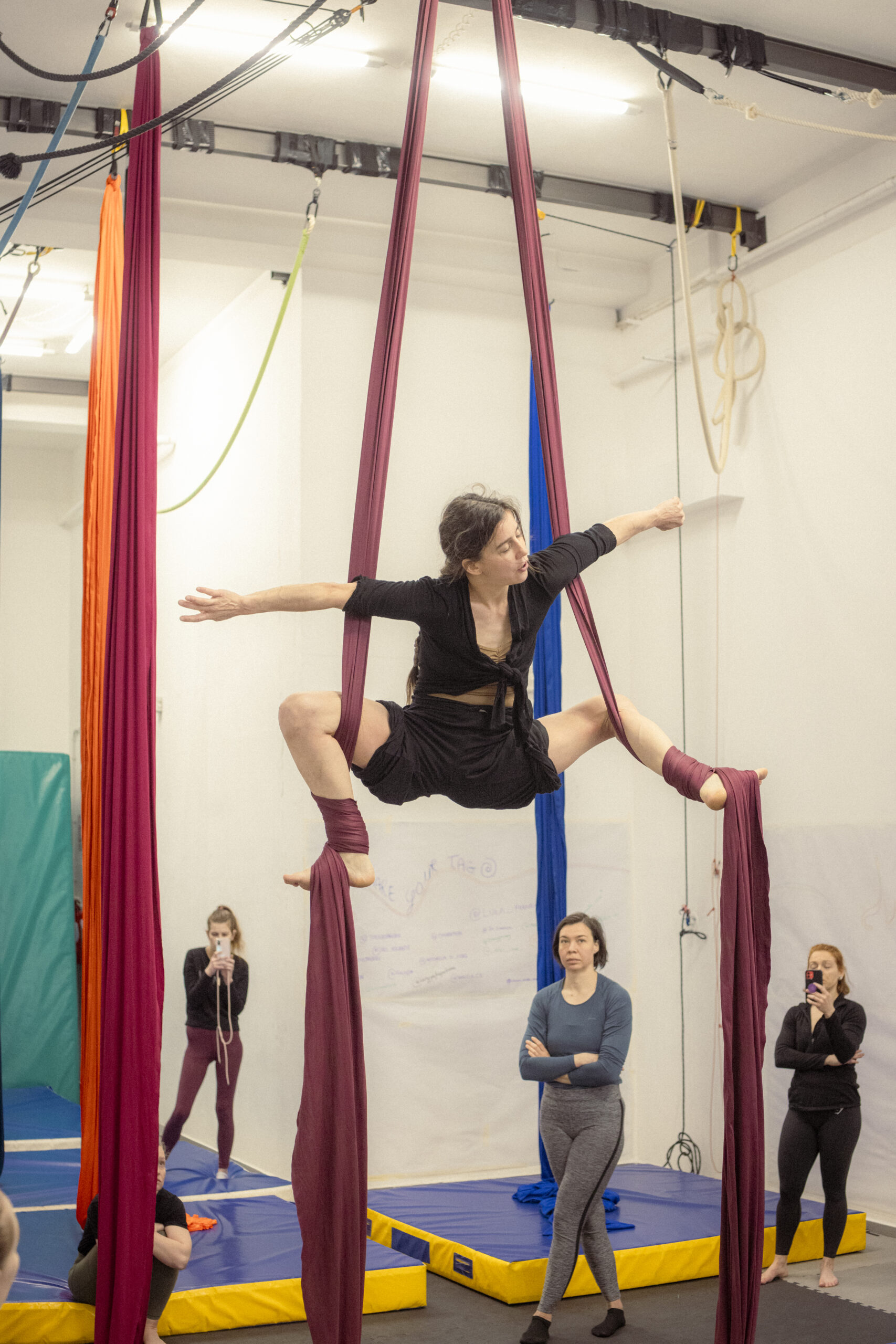 Very good knowledge of basic aerial silks vocabulary (footlocks, climbs, inversions in the air). Ability to comfortably work in the air for at least 3-5 continuous minutes.
